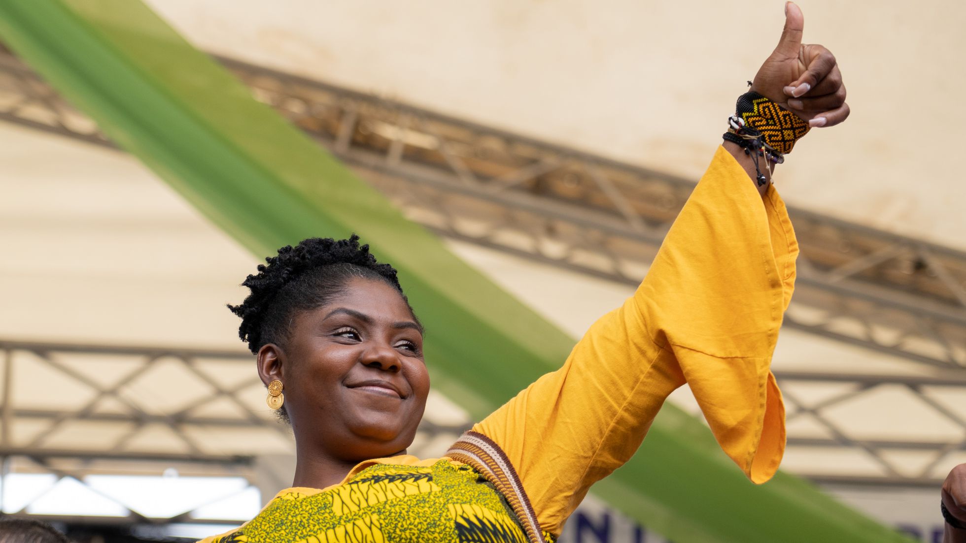 El humor cambia de repente. La protagonista ha trepado al escenario. El público ruge. “¡Viva Francia Márquez, carajo! ¡El pueblo no se rinde, carajo!”. Ella sonríe sin enseñar los dientes, con su vestido amarillo, con su bolso tejido colgando del hombro. Cuando empieza a hablar, la atmósfera ya es completamente otra: