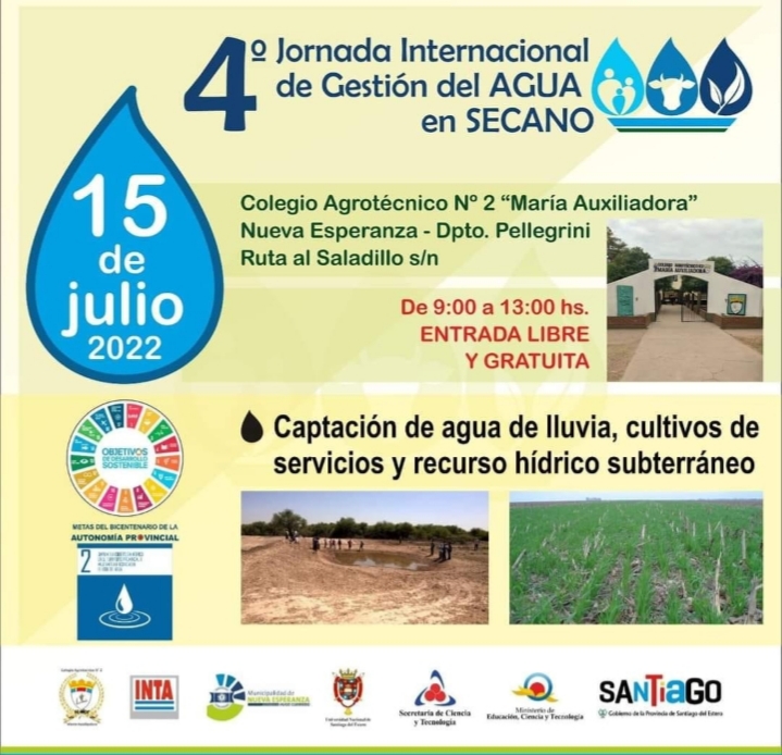 La Secretaría de Ciencia y Tecnología del Gobierno de la Provincia de Santiago del Estero, junto a la UNSE y el INTA, invitan a participar de la 4ta Jornada Internacional de Gestión del Agua en Secano, que se realizará en la ciudad de Nueva Esperanza, Dpto. Pellegrini, el día 15 de Julio, en el horario de 9 a 13, con entrada libre y gratuita.