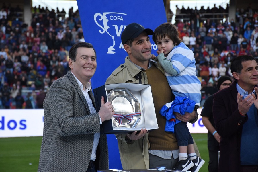 Tras el partido el mandatario entregó una plaqueta de reconocimiento a su trayectoria al ex puma santiagueño Juan Leguizamón y
