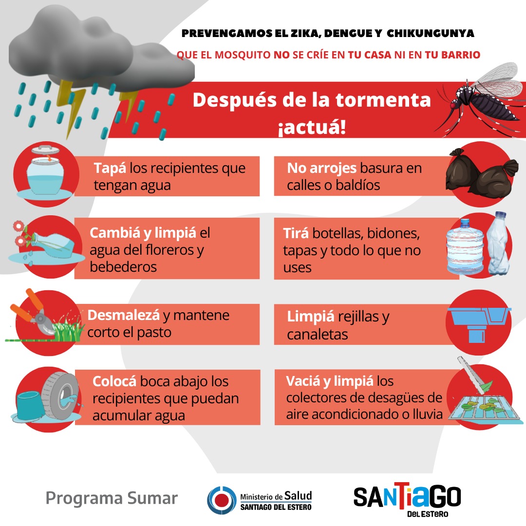 En este sentido, el Ministerio de Salud, a cargo de la Lic. Natividad Nassif, recordó a las familias la necesidad de continuar con las medidas para la eliminación permanente de criaderos de mosquitos. Esto implica tirar los objetos en desuso que puedan acumular agua y colocar boca abajo y bajo techo los recipientes que se utilizan diariamente como baldes, palanganas, latas, frascos o botellas.