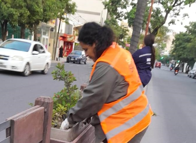 Una cuadrilla de operarias de la Dirección de Parques y Paseos de la Capital realizó tareas de mantenimiento en la platabanda de la avenida Belgrano, entre Alsina y Rivadavia, para conservar la vegetación ornamental y el equipamiento urbano.