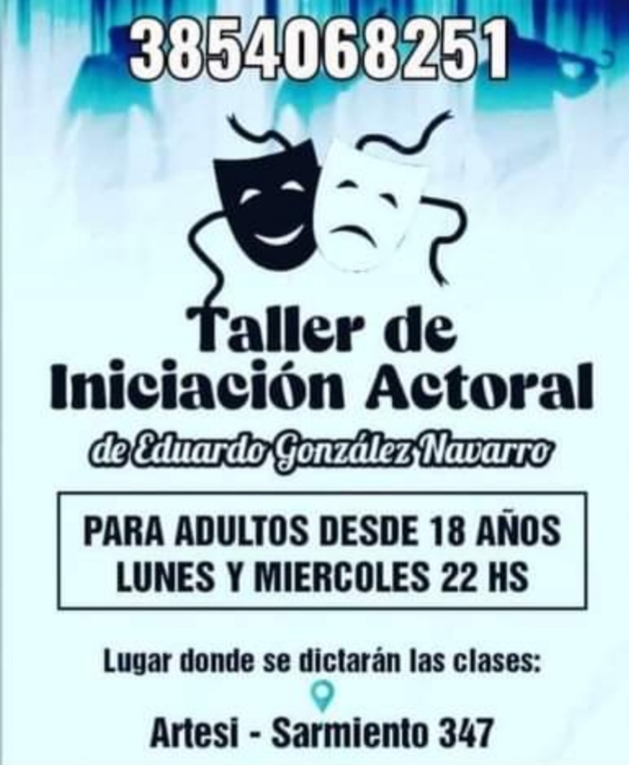 El taller de iniciación actoral se dictará los lunes y miercoles a las 22 hs, en Artesi (sarmiento 347). Estará dirigido por el Profesor y actor Eduardo González Navarro y está destinado para mayores de 18 años.