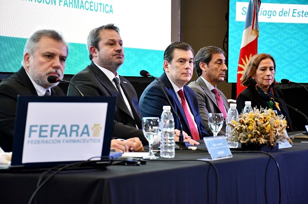 El mandatario provincial estuvo acompañado por el vicegobernador Carlos Silva Neder y la ministra de Salud, Natividad Nassif, quienes compartieron el panel de presentación con el presidente de Fefara, Damián Sudano, y el presidente del Colegio de Farmacéutico, Hugo Navarro.