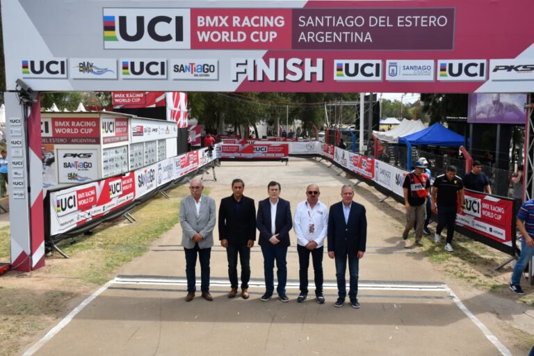 El gobernador Gerardo Zamora junto al jefe de gabinete de ministros, Elías Suarez, participó de la primera jornada de la Copa del Mundo UCI BMX Racing 2025, que se desarrolla del 20 al 21 de septiembre en la pista la Catedral del BMX del Polideportivo provincial, convocando a 300 pilotos de 26 países.